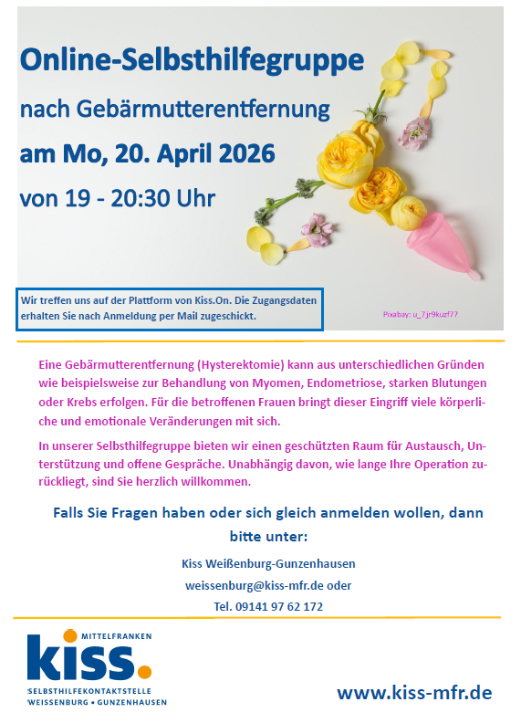 Endometriose: Die Gruppe trifft sich jeden 2. Mittwoch im Monat um 18 Uhr im Selbsthilfezentrum Traunstein. Anmeldung und weitere Informationen gibt es im Selbsthilfezentrum.